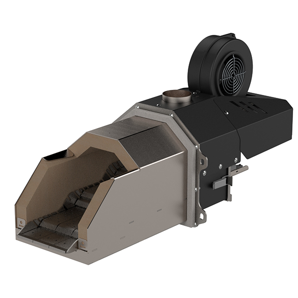 60 kW granulių degiklis. Keraminis uždegiklis, kaskadinės savaiminio valymo grotelės iš AISI 310s plieno (5 mm). Dviejų pakopų priešgaisrinė apsauga.