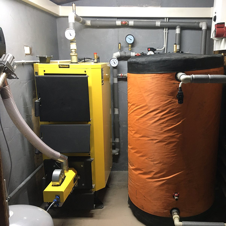 KVIT Sota 45 kW granulių katilo su KVIT Lyuta degikliu montavimas ir paleidimas biuro šildymui. PLUM ecoMAX 850 automatika, trieigis vožtuvas kondensato prevencijai, nerūdijančio plieno kaminas.