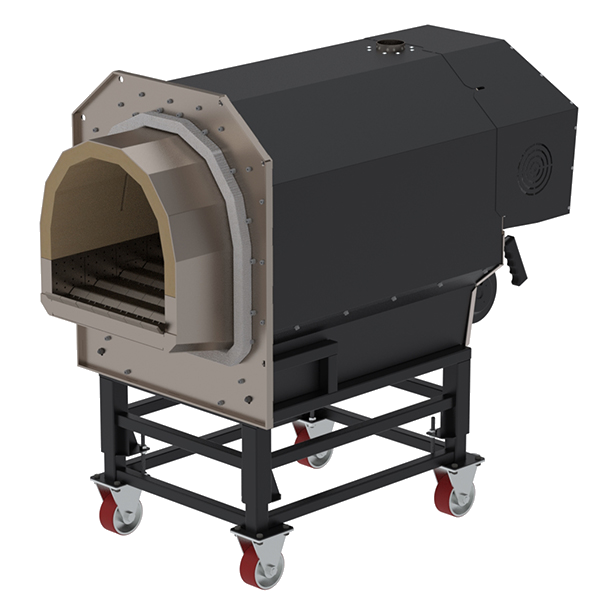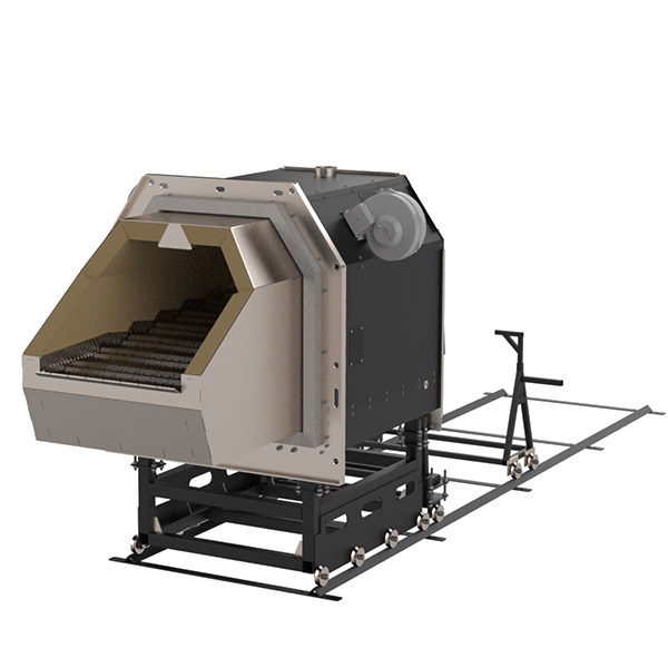 Pramoninis 400 kW granulių degiklis. Kaskadinės grotelių blokas su savaiminio valymu, Double Air sistema, kameros pamušalas. Karščiui atsparus nerūdijantis plienas AISI 310s.